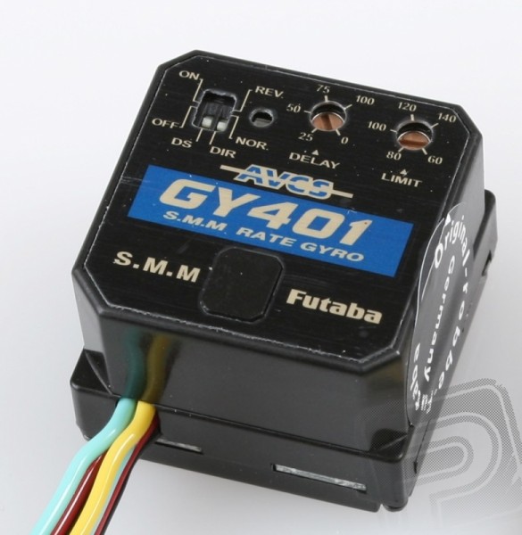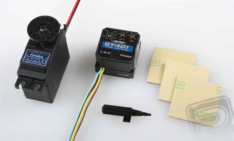Malé piezogyro typu AVCS (heading hold) s nastavitelnou dobou náběhu a dálkově řiditelným ziskem v kompletu digitálním superservem Futaba S-9254.