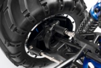 Veškeré spojovací tyče (svorníky ramen apod.) jsou ocelové o průměru 7mm vybavené pravo-levým závitem a šestihranem, což umožňuje pohodlné a přesné nastavení geometrie podvozku. O odpružení se stará čtveřice celokovových olejových tlumičů s vinutými pružinami. Předpětí pružiny je jednoduše nastavitelné pomocí matice s jemným závitem. Modře eloxované držáky tlumičů (parohy) jsou vyrobeny z 8mm silného!!! duralu. Ráfky kol jsou vybaveny šroubovaným límcem, který zajišťuje pneumatiku bez nutnosti lepení. Nízkoprofilové pneumatiky mají osvědčený "buggynový" vzorek a mají průměr 178mm. Bezpečně zastavit tento model to už chce sílu a proto je použita dvojitá kotoučová brzda.