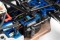 Veškeré spojovací tyče (svorníky ramen apod.) jsou ocelové o průměru 7mm vybavené pravo-levým závitem a šestihranem, což umožňuje pohodlné a přesné nastavení geometrie podvozku. O odpružení se stará čtveřice celokovových olejových tlumičů s vinutými pružinami. Předpětí pružiny je jednoduše nastavitelné pomocí matice s jemným závitem. Modře eloxované držáky tlumičů (parohy) jsou vyrobeny z 8mm silného!!! duralu. Ráfky kol jsou vybaveny šroubovaným límcem, který zajišťuje pneumatiku bez nutnosti lepení. Nízkoprofilové pneumatiky mají osvědčený "buggynový" vzorek a mají průměr 178mm. Bezpečně zastavit tento model to už chce sílu a proto je použita dvojitá kotoučová brzda.