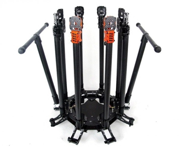 RTF Combo optokoptery Kraken 130 ,set obsahuje uhlíkový skládací rám o průměru 1300mm,motorizovaný podvozek/sklápěcí nohy/,řídící jednotka DJI A2 včetně 50WP,8 xvýkonné motory T-Motor U7 regulátory 80A T-motor,karbonové vrtule 18*6!,Akumulátor TATTU 6s 16000mAh.RC systém FUTABA 14 SG. Ochranná kopule.Celková letová hmotnost modelu je až 20kg.Doporučená max 15 kg.