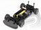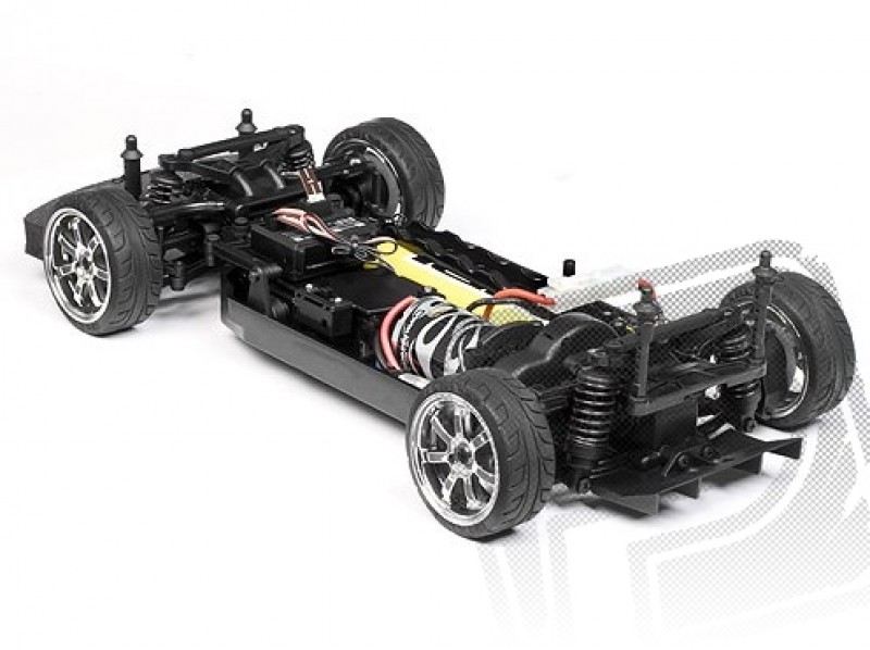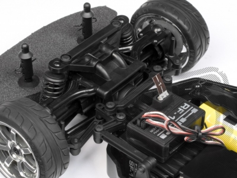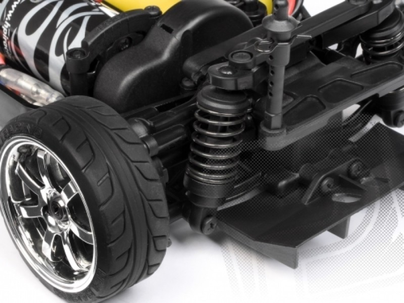 Základ podvozku tvoří plastová vana chránící model před před špínou z okolí. Nezávislé zavěšení kol tvořené dole lichoběžníkovými a nahoře trojúhelníkovými rameny umožňuje rychlé projíždění zatáček. Hliníkové tlumiče usnadní jízdu i na méně kvalitním povrchu. O pohon se stará stejnosměrný motor velikosti "540". Celá geomtrie je už pevně nastavena z továrny. Pneumatiky jsou se šípovým vzorem a na diskách s imatací hliníku. Specialitou podvozku je možnost posunout motor dopředu.